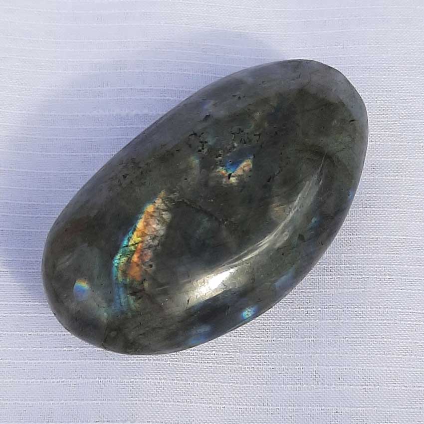 Mooie handsteen van Labrodoriet met kleine regenboog glinsteringen er in.