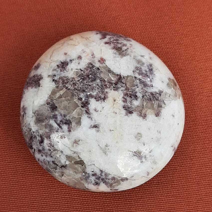 Mooie ronde handsteen van lepidoliet met kwarts.