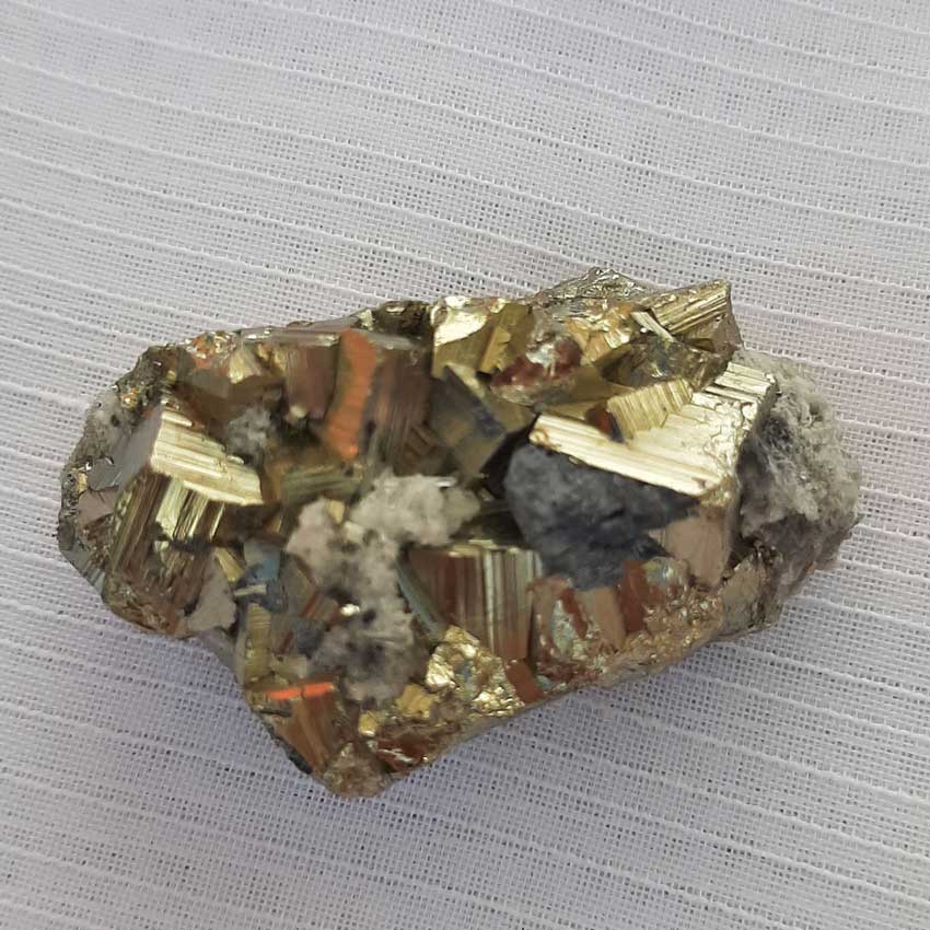 Prachtige steen uit Bulgarije met Calciet en pyriet erop. het is een gemixte steen met meerdere kristallen erin.