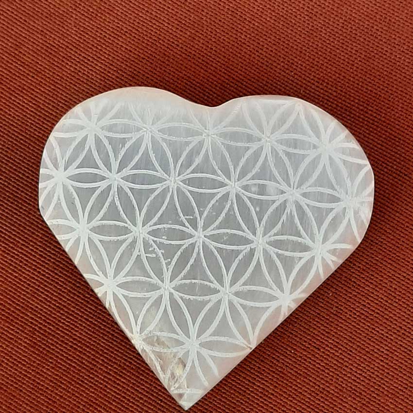 Dit hartje van satijnspaat heeft mooie gegraveerde bloemen erop. Satijnspaat is ook bekend onder de naam seleniet.