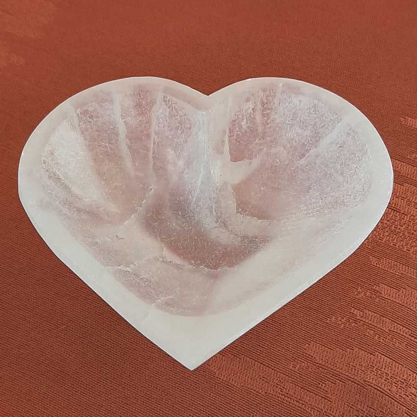 Dit mooie schaaltje van satijnspaat in de vorm van een hartje. Satijnspaat is ook bekend onder de naam seleniet.