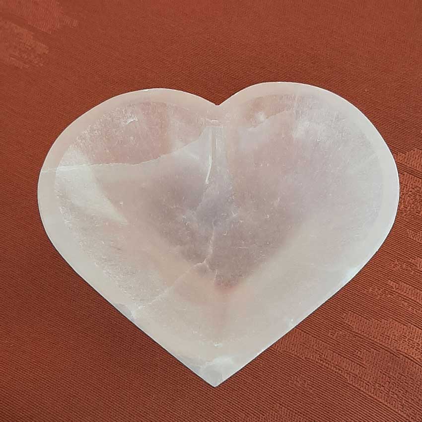 Dit mooie schaaltje van satijnspaat in de vorm van een hartje. Satijnspaat is ook bekend onder de naam seleniet.
