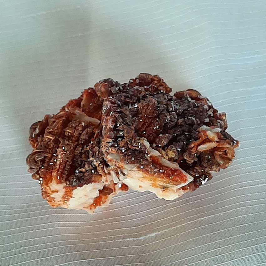 Glinsterende stukjes vanadiniet. De kleine en grote rood-oranje kubusjes van vanadiniet zijn gevormd op bariet en schitteren alle kanten op!