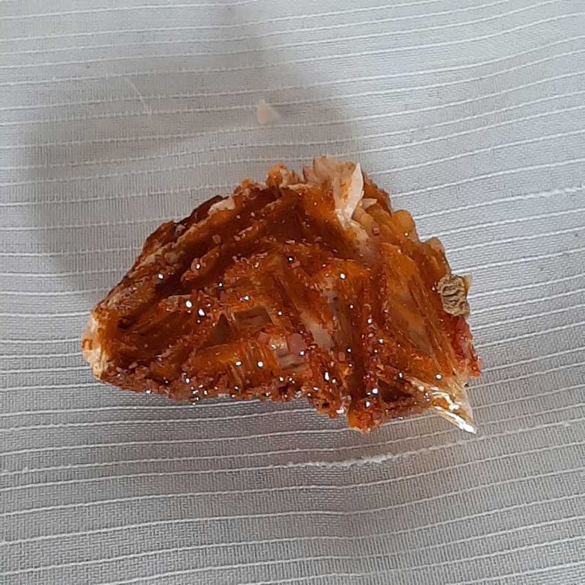 Glinsterende stukjes vanadiniet. De kleine rood-oranje kubusjes van vanadiniet zijn gevormd op bariet en schitteren alle kanten op!