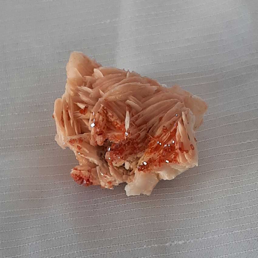 Glinsterende stukjes vanadiniet. De zalm kleurige bariet met de rood-oranje blokjes van vanadiniet eroverheen.